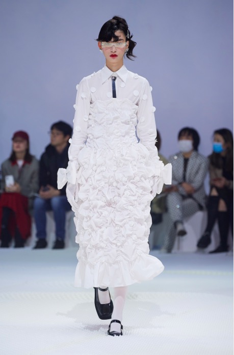 波点元素、网状结构、具有未来感的印花、亮片、反光材质、防水雨衣布面料的运用和利落的剪裁处理,无一不打造了融合 Space Age 未来感与复古风潮的系列服饰。本系列中波点元素的运用方式十分多样,例如在皮草上通过按压形成凹面波点、抑或是通过 手工缝合打造立体波点。设计师将少女感和超前卫未来感相结合,挣脱传统的框架,形成了一 个创新而和谐的整体。